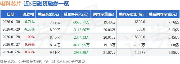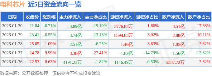 证券之星消息,截至2026年1月30日收盘,电科芯片(600877)报收于21.84元,下跌6.71%,换手率7.71%,成交量91.23万手,成交额20.26亿元。