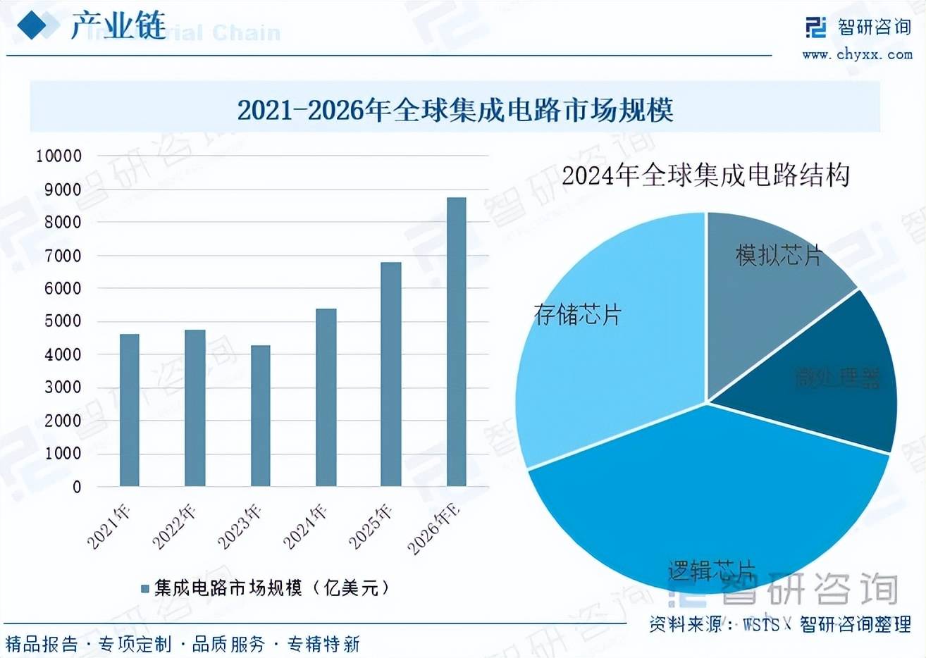 2024年,人工智能、先进计算需求爆发,叠加消费电子市场复苏,全球集成电路市场规模恢复至5395.05亿美元,同比增长25.9%,其中逻辑芯片规模为2157.68亿美元,存储芯片规模为1655.16亿美元。2025年,受益于人工智能应用及数据中心基础设施的强劲需求,推动了对于逻辑芯片和存储芯片需求的增长,带动集成电路市场规模达6778.52亿美元,同比增长25.6%,预计2026年将大幅增长至8742.91亿美元。