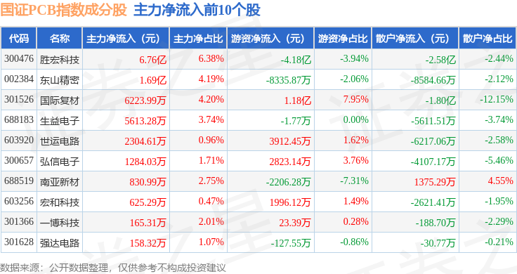 资金流向方面,国证PCB(980115)指数成份股当日主力资金净流出合计4.82亿元,游资资金净流入合计4.88亿元,散户资金净流出合计523.78万元。成份股资金流向详情见下表:
