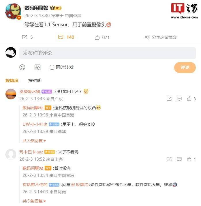 IT之家注意到,博主今日继续爆料,称“绿绿”(此处预计代指 OPPO)也在看 1:1 方形传感器,用于前置摄像头。有网友询问 OPPO Find X9 Ultra 能否用上这款传感器,博主表示:“迭代旗舰线测试的东西。”还有网友询问小米是否在看该传感器,博主回复称:“暂时没有。”