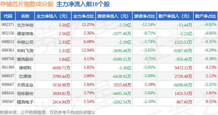 资金流向方面,存储芯片(980138)指数成份股当日主力资金净流出合计18.95亿元,游资资金净流出合计2.09亿元,散户资金净流入合计21.04亿元。成份股资金流向详情见下表: