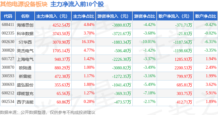 从资金流向上来看,当日其他电源设备板块主力资金净流出3.15亿元,游资资金净流出2.33亿元,散户资金净流入5.48亿元。其他电源设备板块个股资金流向见下表:
