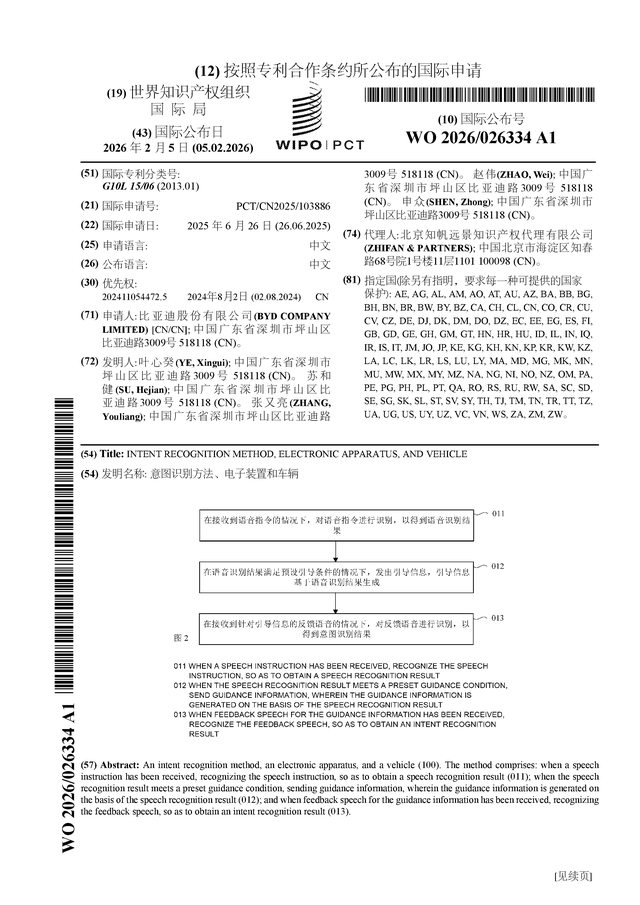 证券之星消息,根据企查查数据显示比亚迪(002594)公布了一项国际专利申请,专利名为“意图识别方法、电子装置和车辆”,专利申请号为PCT/CN2025/103886,国际公布日为2026年2月5日。