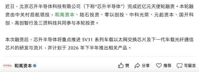 本次融资后,芯升半导体将重点推进SV31系列车载以太网交换芯片及下一代车载光纤通信芯片的研发与流片,并计划于2026年下半年推出相关产品。