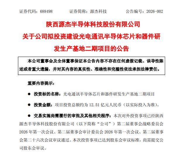 2月9日,源杰科技(688498.SH)公告称,公司计划投资约12.51亿元人民币建设光电通讯半导体芯片和器件研发生产基地二期项目。项目聚焦高速光芯片领域,旨在通过产能扩充与工艺优化,持续响应市场需求变化,提升公司在全球光芯片领域的市场份额与综合竞争力。项目建成后,将有助于公司把握市场增长机遇,满足客户在数据中心建设等领域持续提升的产品需求,增强订单交付的稳定性与响应速度。