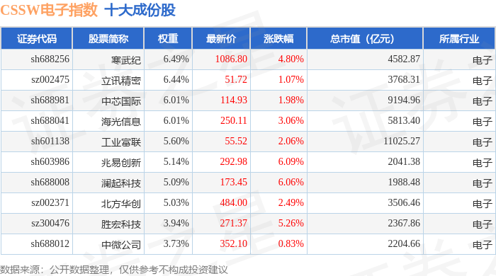 证券之星消息,2月9日,CSSW电子(399811)指数报收于6008.0点,涨3.1%,成交1350.71亿元,换手率1.9%。当日该指数成份股中,上涨的有55家,芯原股份以14.87%的涨幅领涨,下跌的有4家,燕东微以3.19%的跌幅领跌。