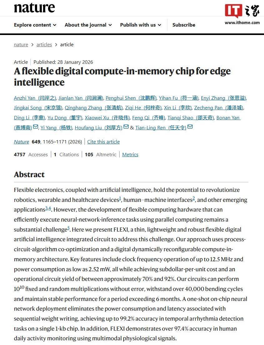 IT之家 2 月 10 日消息,维信诺官方昨日发文分享,1 月 28 日,清华大学联合北京大学与维信诺合作开发了世界首款柔性存算芯片—— FLEXI,相关成果以《A flexible digital compute-in-memory chip for edge intelligence》为题在国际顶级期刊《自然》(Nature)上发表。