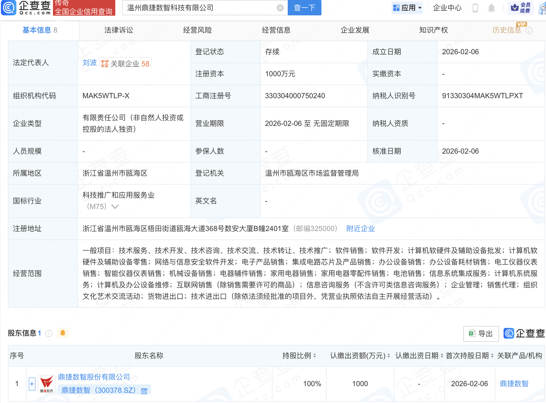 企查查APP显示,近日,温州鼎捷数智科技有限公司成立,注册资本1000万元,经营范围包含:集成电路芯片及产品销售;办公设备销售;办公设备耗材销售;电工仪器仪表销售等。企查查股权穿透显示,该公司由鼎捷数智(300378)全资持股。