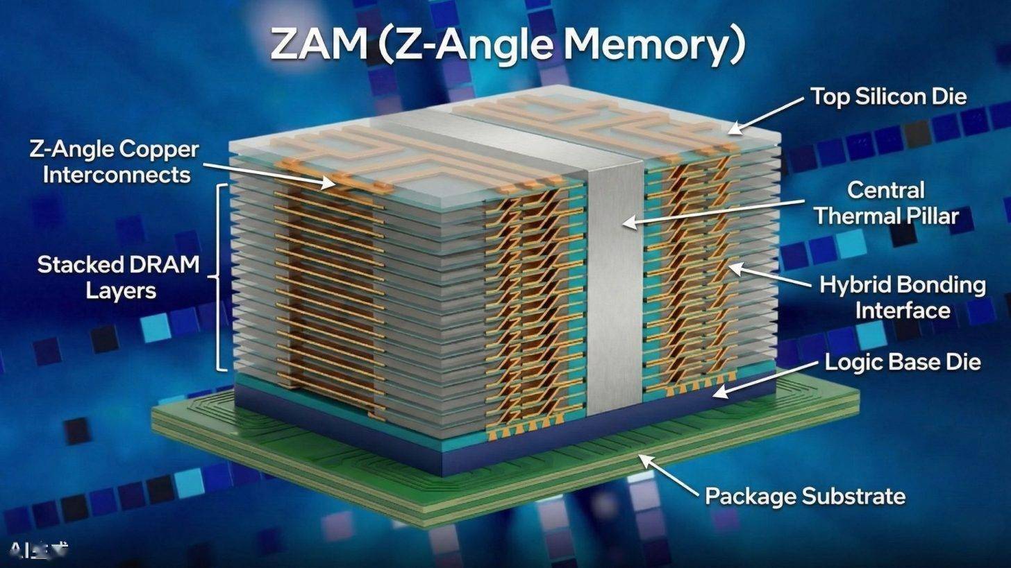 IT之家援引博文介绍,ZAM 技术的核心在于其独特的“Z-Angle”架构。与传统 HBM 内存垂直钻孔(TSV)的连接方式不同,ZAM 采用了错位互连拓扑结构(staggered interconnect topology),在芯片堆叠内部实现对角线走线。英特尔指出,这种架构设计能从物理层面有效解决现有内存解决方案面临的散热瓶颈,并大幅优化计算性能。