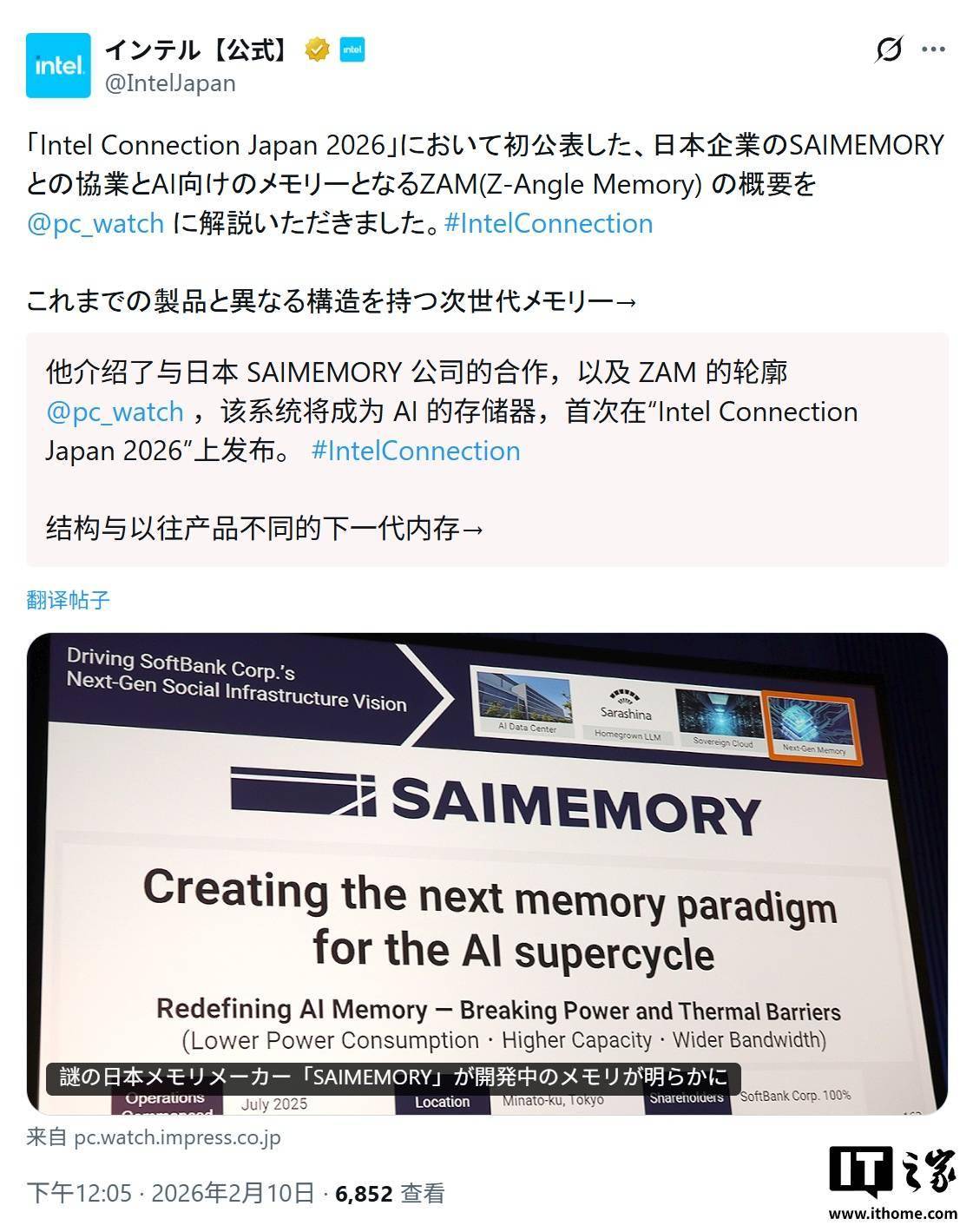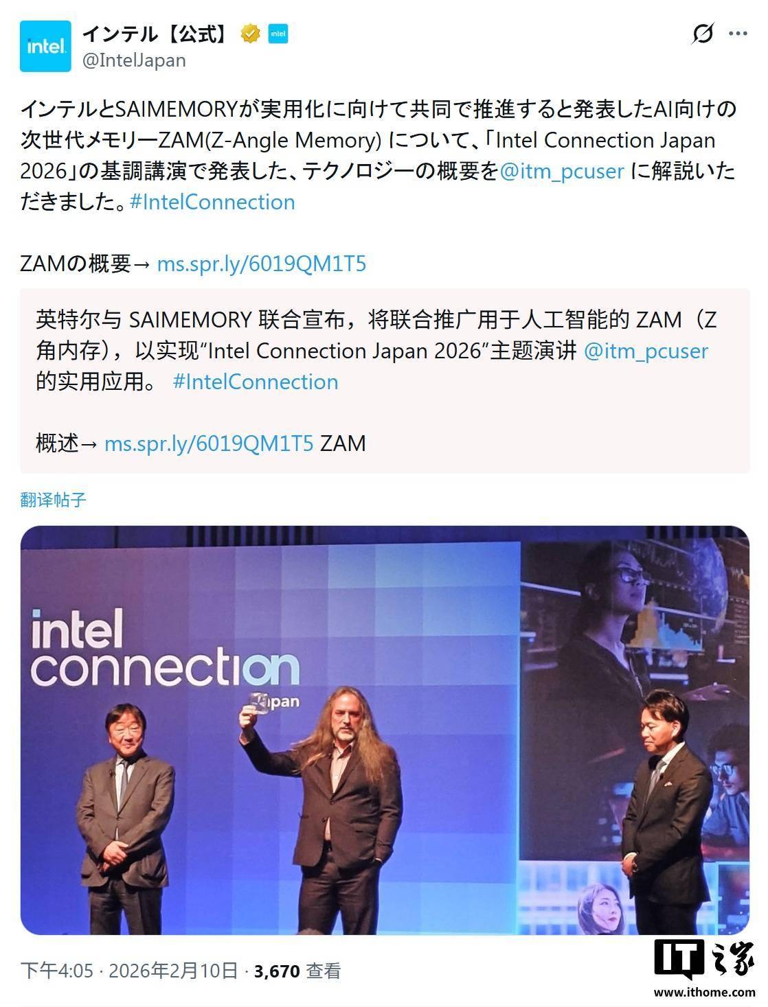 IT之家 2 月 11 日消息,科技媒体 Wccftech 昨日(2 月 10 日)发布博文,报道称在 Intel Connection Japan 2026 活动中,英特尔首次公开了“Z-Angle Memory”(ZAM)内存原型。