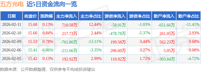 证券之星消息,截至2026年2月11日收盘,五方光电(002962)报收于15.68元,上涨0.13%,换手率1.74%,成交量3.65万手,成交额5713.18万元。