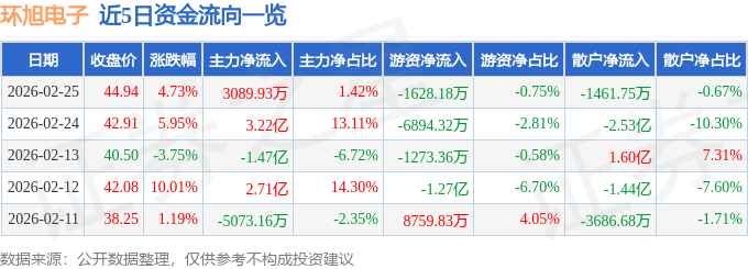 证券之星消息,截至2026年2月25日收盘,环旭电子(601231)报收于44.94元,上涨4.73%,换手率2.11%,成交量50.34万手,成交额21.8亿元。