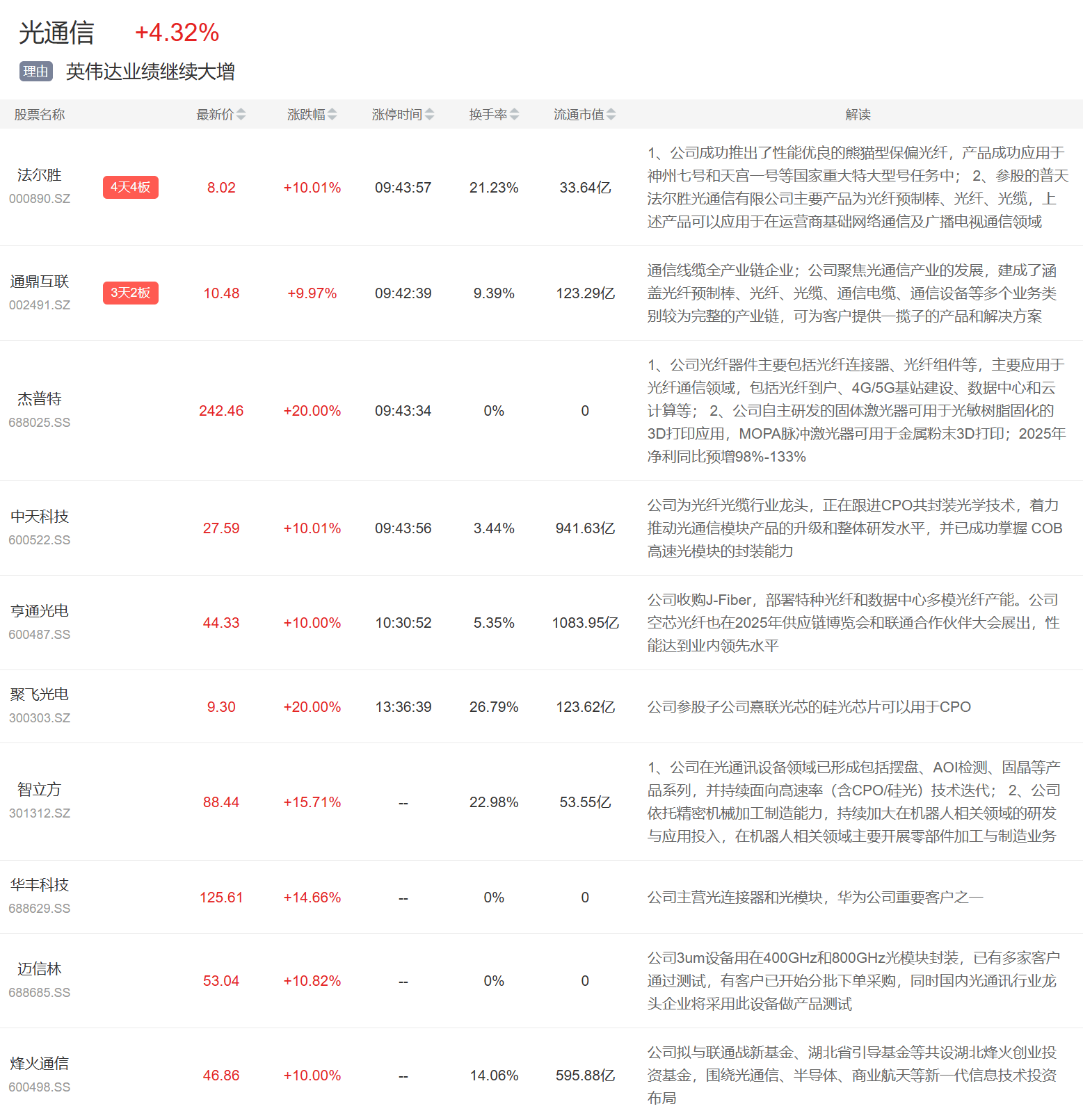 光通信概念今日大涨,法尔胜4连板,光纤通鼎互联、亨通光电、烽火通信等涨停,CPO概念杰普特20cm涨停。