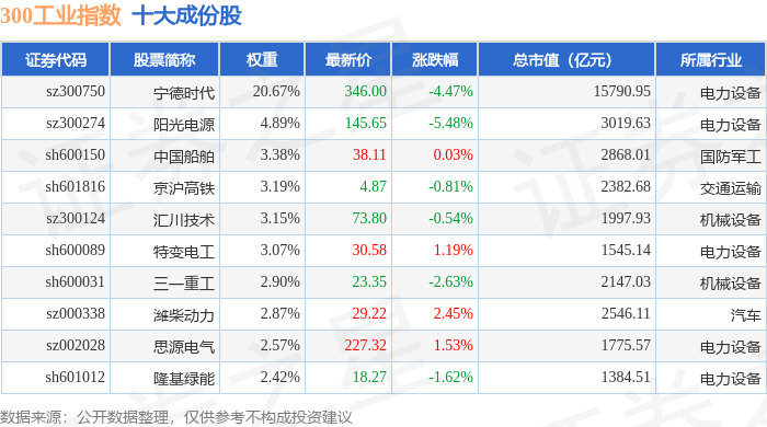 300工业(000910)指数十大成份股详情如下: