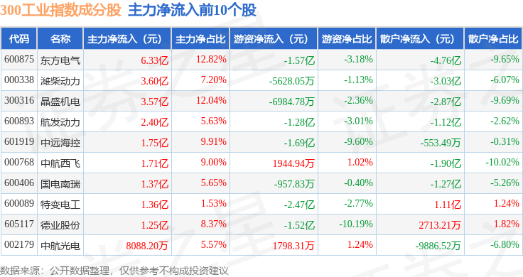 资金流向方面,300工业(000910)指数成份股当日主力资金净流出合计63.55亿元,游资资金净流入合计18.81亿元,散户资金净流入合计44.75亿元。成份股资金流向详情见下表: