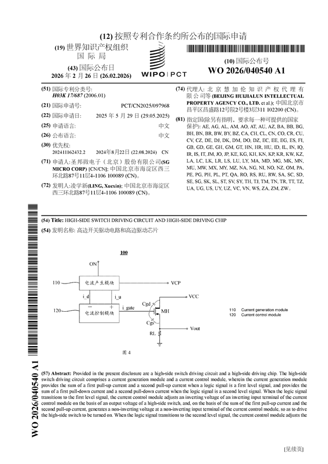 证券之星消息,根据企查查数据显示圣邦股份(300661)公布了一项国际专利申请,专利名为“高边开关驱动电路和高边驱动芯片”,专利申请号为PCT/CN2025/097968,国际公布日为2026年2月26日。