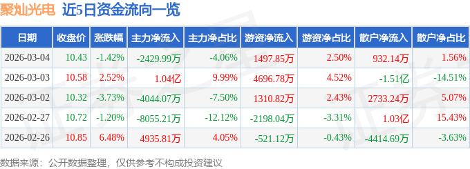 证券之星消息,截至2026年3月4日收盘,聚灿光电(300708)报收于10.43元,下跌1.42%,换手率8.07%,成交量57.27万手,成交额5.98亿元。