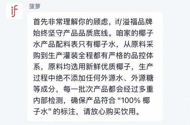 面对此番加糖加水质疑,if尚未有官方回复,但if官方旗舰店客服表示:“原料均选用新鲜优质椰子,生产过程中绝不添加任何外源水、外源糖等成分,每一批次产品都会经过多重内部检测,确保产品符合‘100%椰子水’的标注。”