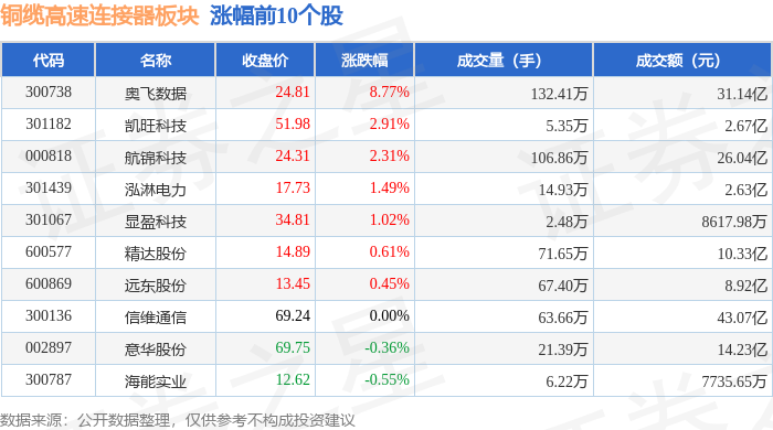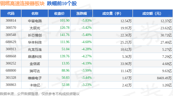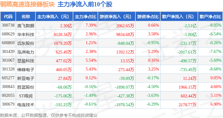 从资金流向上来看,当日铜缆高速连接器板块主力资金净流出19.85亿元,游资资金净流入6171.88万元,散户资金净流入19.23亿元。铜缆高速连接器板块个股资金流向见下表: