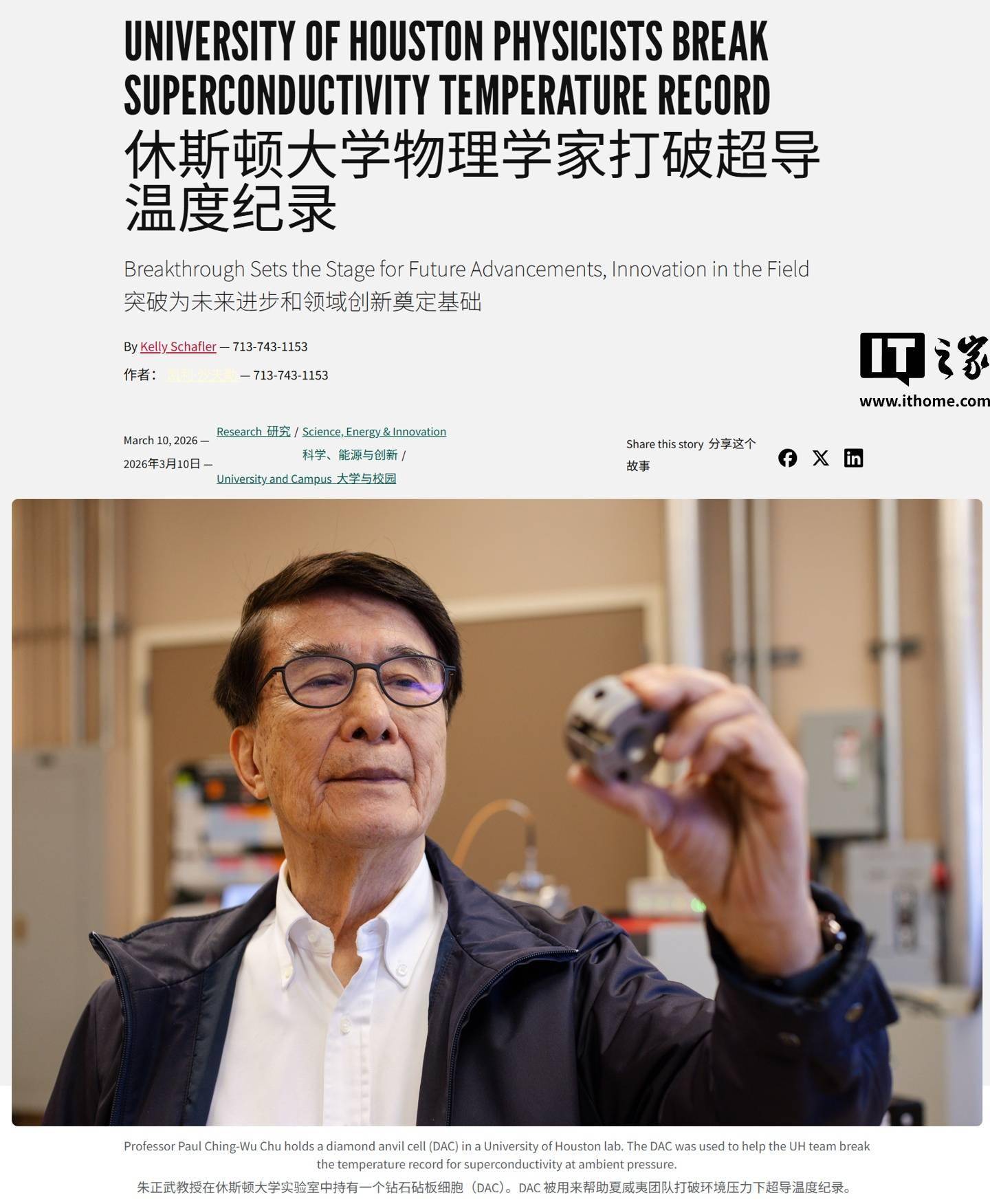 IT之家 3 月 13 日消息,休斯顿大学(UH)于 3 月 10 日发布博文,宣布携手来自美国得克萨斯超导中心(TcSUH)的物理学家,打破了保持 30 多年的 133 开尔文旧纪录,创造了 151 开尔文(约-122℃)的常压超导转变温度新世界纪录。