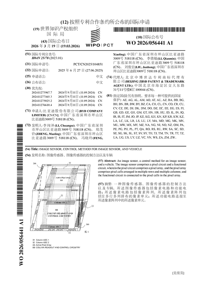 证券之星消息,根据企查查数据显示比亚迪(002594)公布了一项国际专利申请,专利名为“图像传感器、图像传感器的控制方法以及车辆”,专利申请号为PCT/CN2025/104851,国际公布日为2026年3月19日。