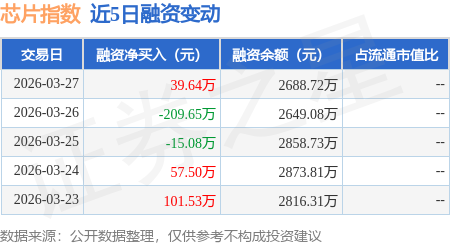 证券之星消息,3月27日,芯片指数(159599)融资买入114.87万元,融资偿还75.23万元,融资净买入39.64万元,融资余额2688.72万元。