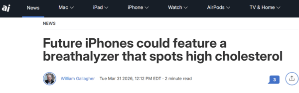 这一技术看似仅针对单一病症检测,但苹果表示,它可用于筛查糖尿病、高胆固醇及其他疾病。苹果的设计思路是,将用户呼气数据与数据库进行比对,随后向用户推送潜在健康风险提示,就像当前Apple Watch健康传感器可建议用户就医一样。