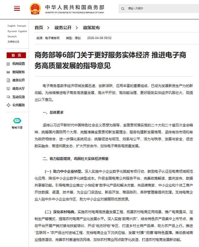 原标题:商务部等6部门关于更好服务实体经济 推进电子商务高质量发展的指导意见