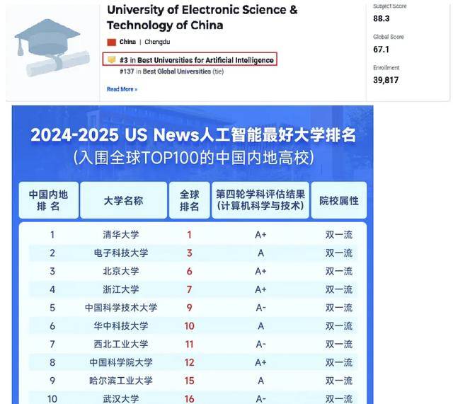 近日,记者从电子科技大学终身学习中心获悉,根据U.S.News世界大学排名发布的2025-2026全球人工智能最佳大学排名,电子科技大学上榜,排名全球第三。