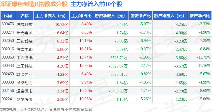 资金流向方面,深证绿色制造R(470069)指数成份股当日主力资金净流入合计55.12亿元,游资资金净流出合计23.85亿元,散户资金净流出合计31.27亿元。成份股资金流向详情见下表: