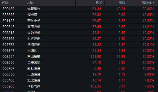 电子板块表现较好,板块内个股再度掀起涨停潮,其中光智科技“20cm”涨停,锴威特、奕东电子、胜蓝股份涨幅超过10%,大为股份、五方光电、沃格光电、恒铭达、东山精密、金安国纪等股票强势涨停。