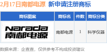 证券之星消息,根据企查查数据显示,近日浙江南都电源动力股份有限公司新提交“南都电源”商标注册申请。商标申请详情如下: