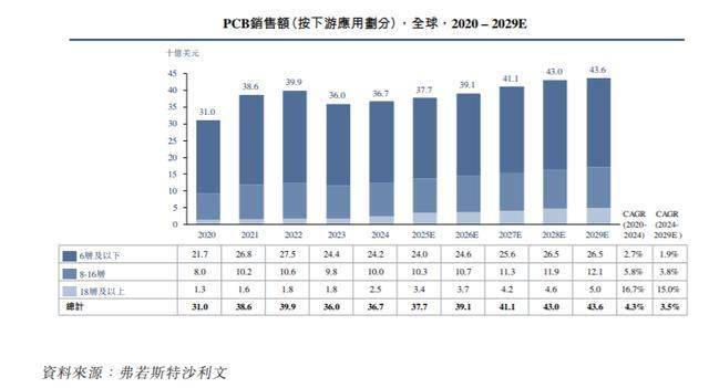 从产品角度来看,多层PCB在全球PCB整体市场中占比最高,2024年全球多层PCB的销售额为367.0亿美元,占比为48.9%。随著全球对算力需求的提升,预计未来高多层板和HDI PCB凭借其高密度互联、高性能数据传输、优越的散热性能、高可靠性和稳定性等优势,成为满足现代服务器复杂计算需求的最佳选择。全球多层PCB和HDI PCB的销售额有望在2029年分别达到436.0亿美元和169.0亿美元,2024年至2029年的年复合增长率分别为3.5%和5.7%。