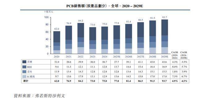 按销售额统计,全球PCB市场规模整体呈现稳步增长的态势。从2020年的620.0亿美元增长至2024年的750.0亿美元,期间年复合增长率为4.9%。预计未来随著全球宏观经济复苏,以及数据中心、AI、自动驾驶、AR/VR等新兴应用的增长,2024年至2029年全球PCB市场规模有望稳健成长,年复合增长率预计达到4.5%。