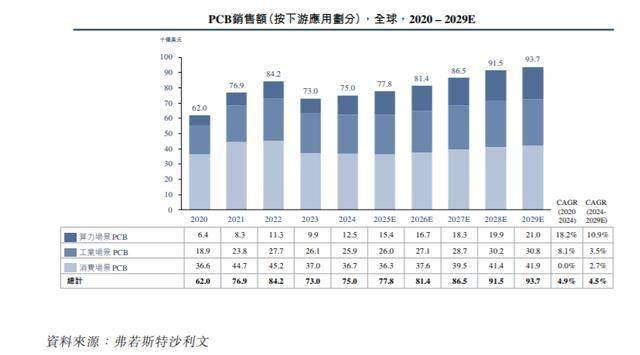 从下游应用来看,2024年算力场景产品PCB的销售额达到125.0亿美元,并预计在2029年增长至210.0亿美元,是增速最快的细分赛道,期间年复合增长率为10.9%。2024年工业场景产品PCB的销售额为259.0亿美元,预计在2029年增长至308.0亿美元,期间年复合增长率为3.5%。消费场景产品PCB的销售额有望从2024年的367.0亿美元增长至2029的419.0亿美元,期间年复合增长率为2.7%。