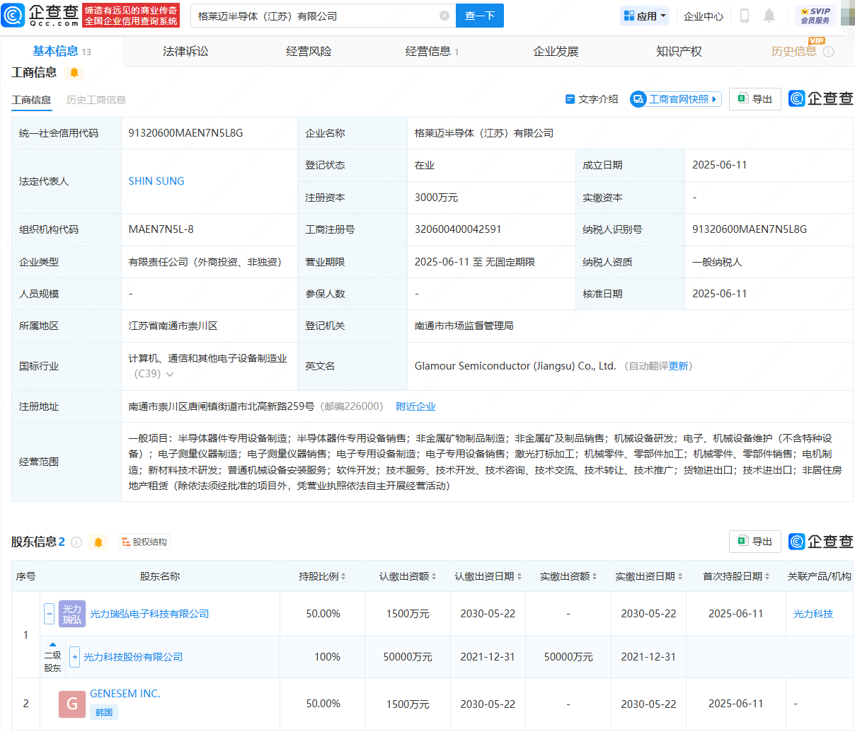 企查查APP显示,近日,格莱迈半导体(江苏)有限公司成立,法定代表人为SHIN SUNG,注册资本为3000万元,经营范围包含:半导体器件专用设备制造;半导体器件专用设备销售;非金属矿物制品制造;非金属矿及制品销售;机械设备研发;电机制造等。企查查股权穿透显示,该公司由光力科技(300480)旗下光力瑞弘电子科技有限公司、GENESEM INC.共同持股。