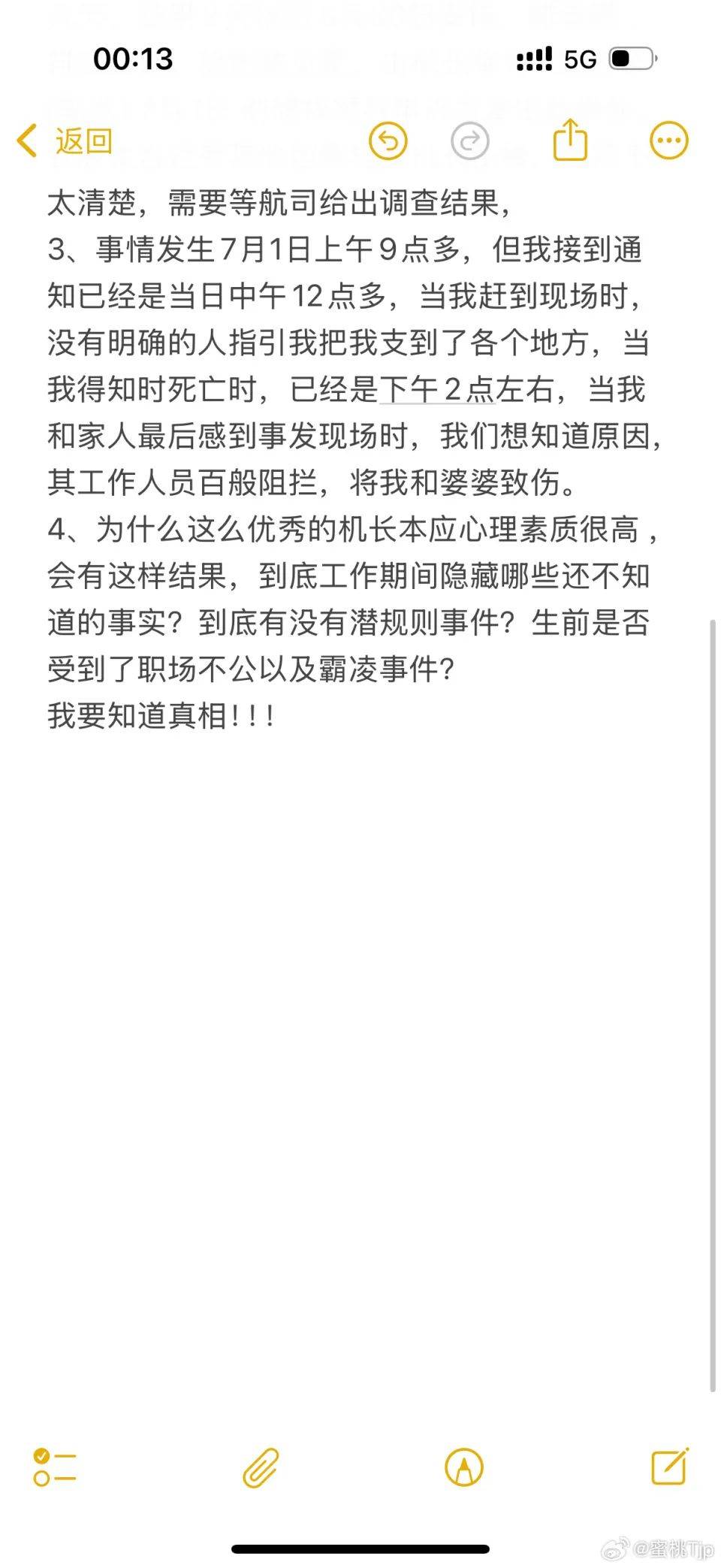 7月4日,李某妻子@蜜桃Tjp 发声:丈夫出事后南航无任何人通知家属,一个工作近10年的飞行员,工作期间得过很多奖,为何会突然身亡,他在公司遭受了什么不公待遇,自己要了解真相。