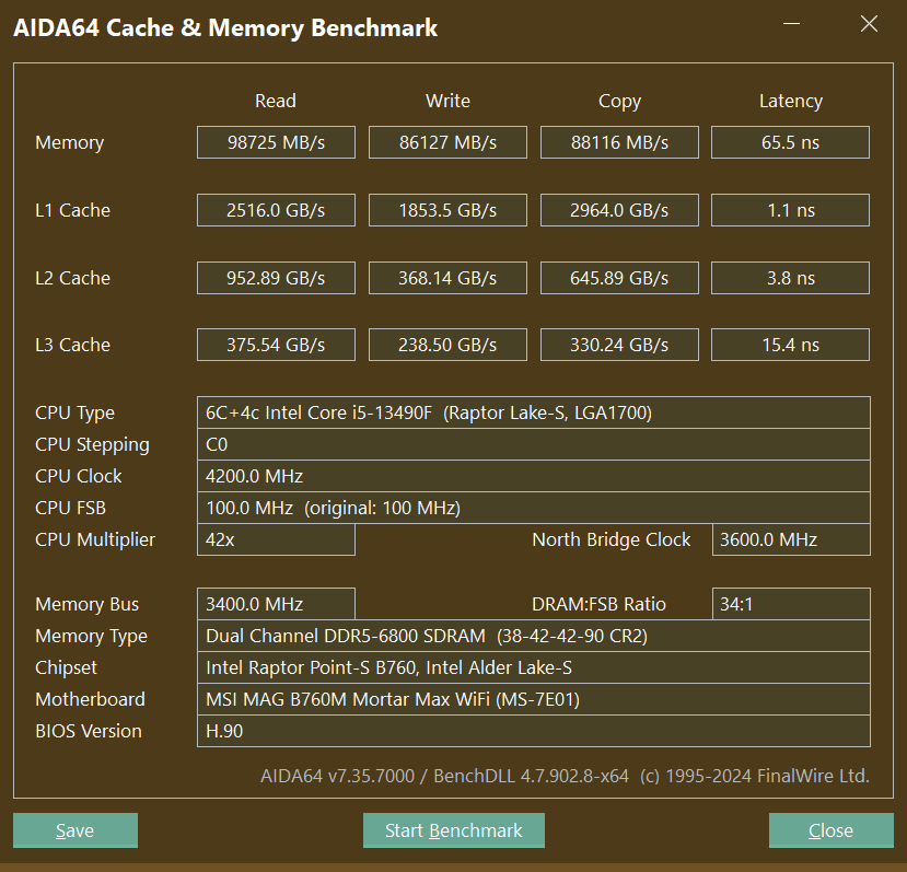 时序38-42-42-90,读取速度接近10GB/S,延迟控制在65ns,可以看出13490F的内存控制器太拉跨了,如果不是因为近期cpu疯狂涨价,对就算是缩肛的13/14系列CPU全系涨价,用13600KF轻松可以上8000MHz频率。