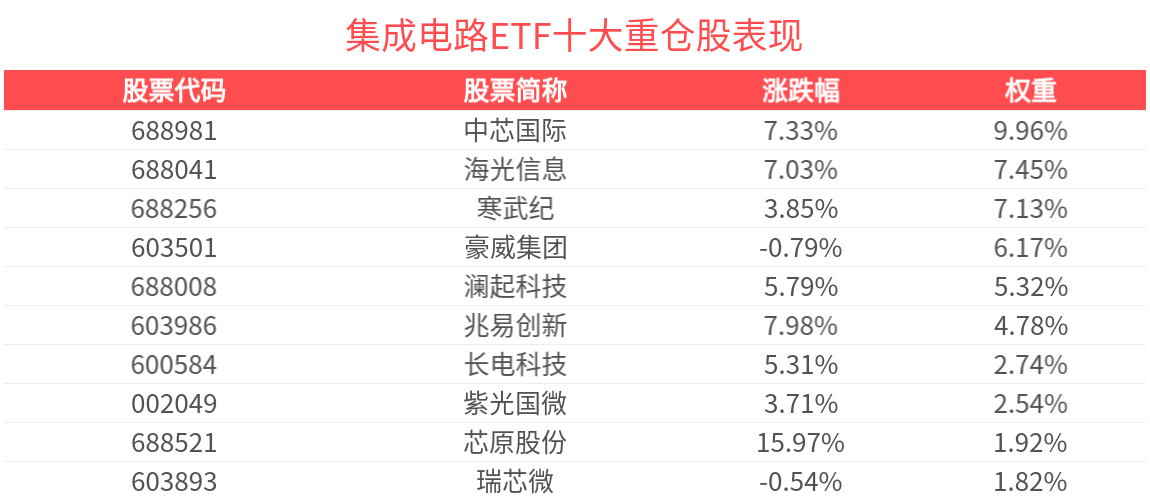 数据显示,截至2025年9月30日,中证全指集成电路全收益指数前十大权重股分别为中芯国际、寒武纪、海光信息、澜起科技、兆易创新、豪威集团、芯原股份、长电科技、紫光国微、通富微电,前十大权重股合计占比55.71%。