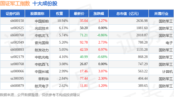 国证军工(399368)指数十大成份股详情如下: