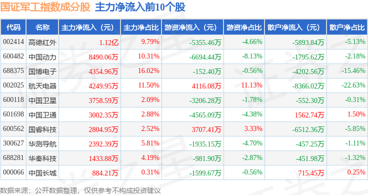 资金流向方面,国证军工(399368)指数成份股当日主力资金净流出合计19.89亿元,游资资金净流入合计5.71亿元,散户资金净流入合计14.18亿元。成份股资金流向详情见下表: