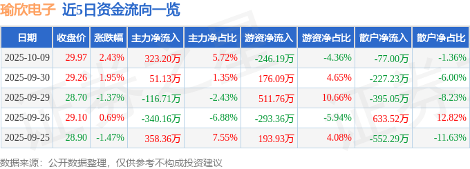 证券之星消息,截至2025年10月9日收盘,瑜欣电子(301107)报收于29.97元,上涨2.43%,换手率3.17%,成交量1.89万手,成交额5650.69万元。