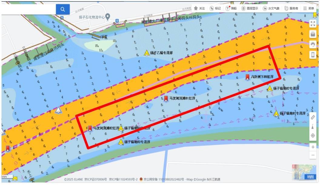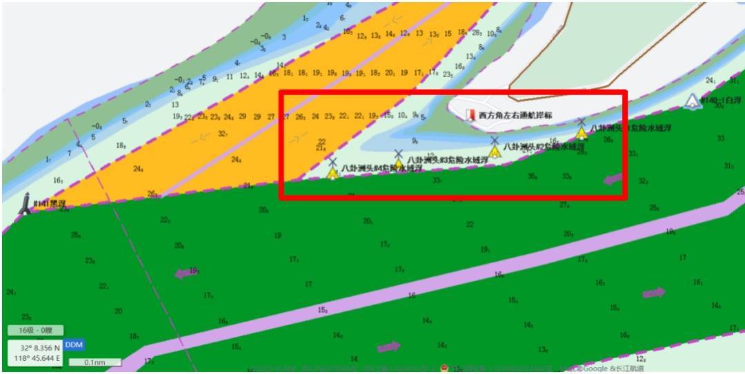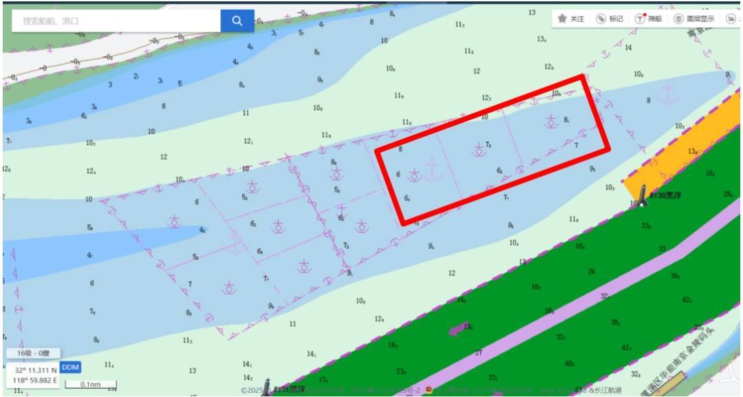 中下段水深变浅,#1、#2、#3锚位图示水深不足7米,最浅图示水深6.7米。