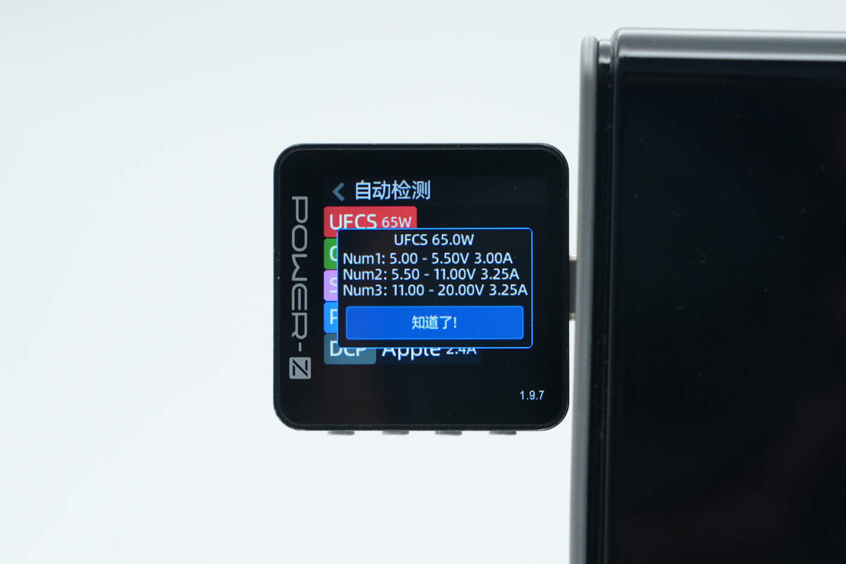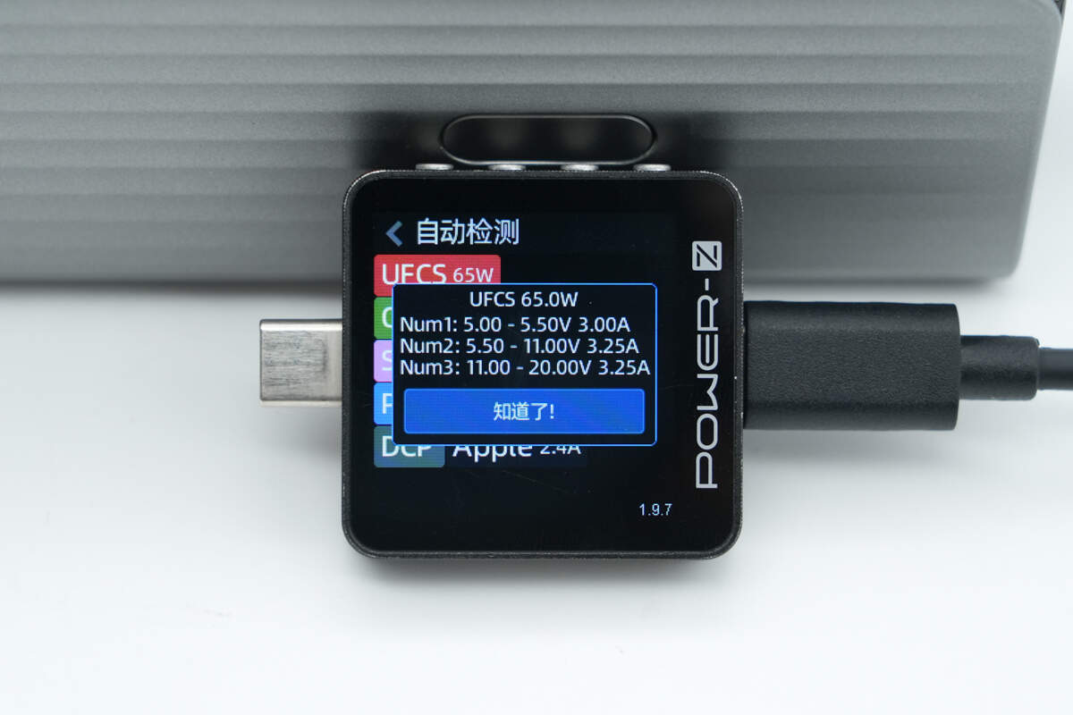 测得UFCS融合快充具备5-5.5V3A、5.5-11V3.25A、11-20V3.25A三组电压档位。