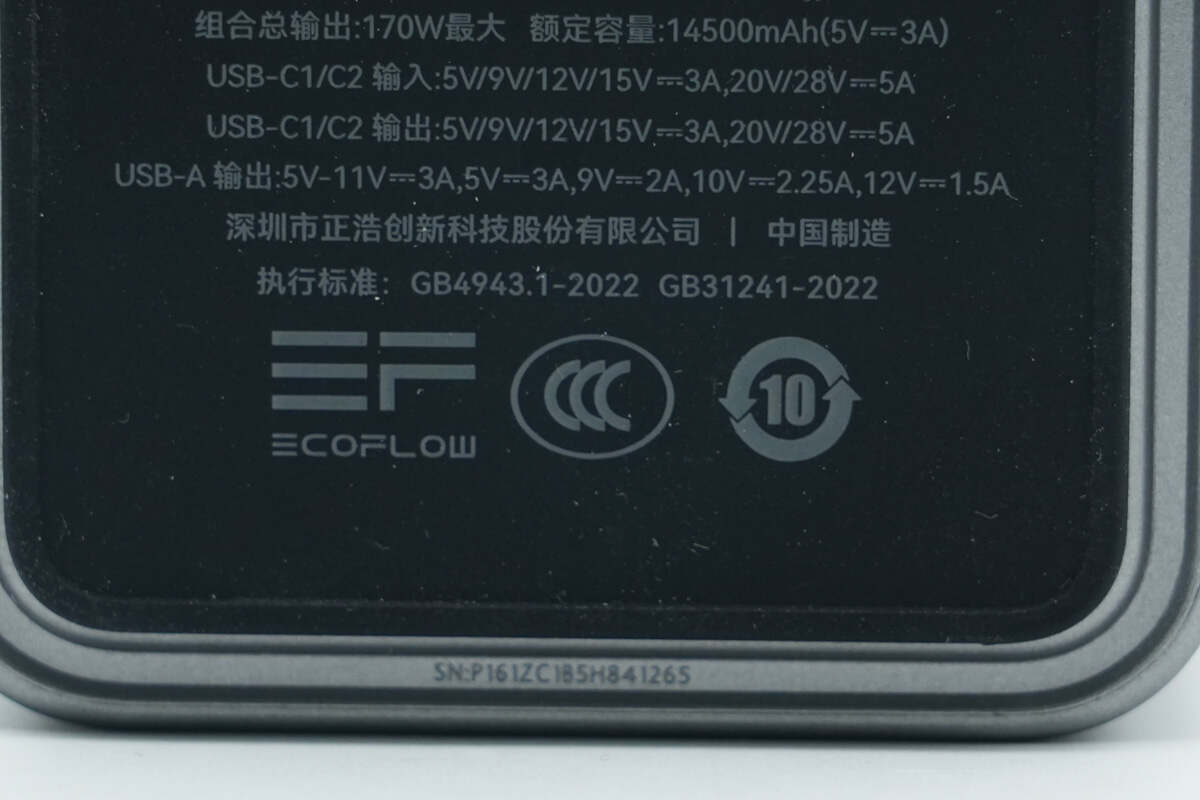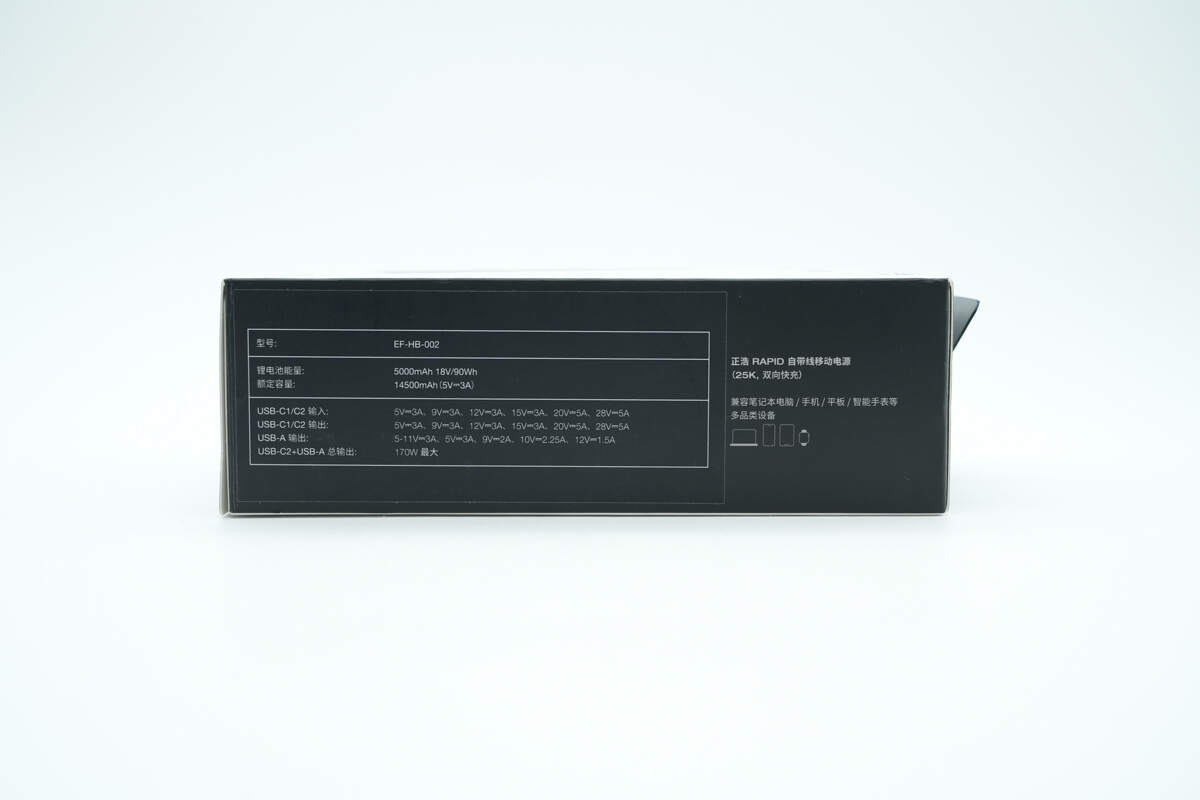 另一侧配置USB-C2双向快充接口,接口右侧壳体上印有170W、25000mAh/90Wh以及可携带上飞机标识。