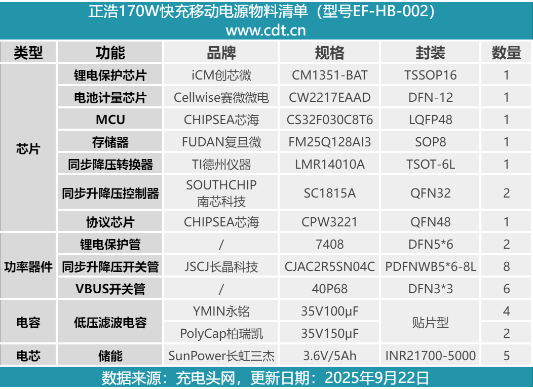 最后附上正浩170W快充移动电源的核心器件清单,方便大家查阅。