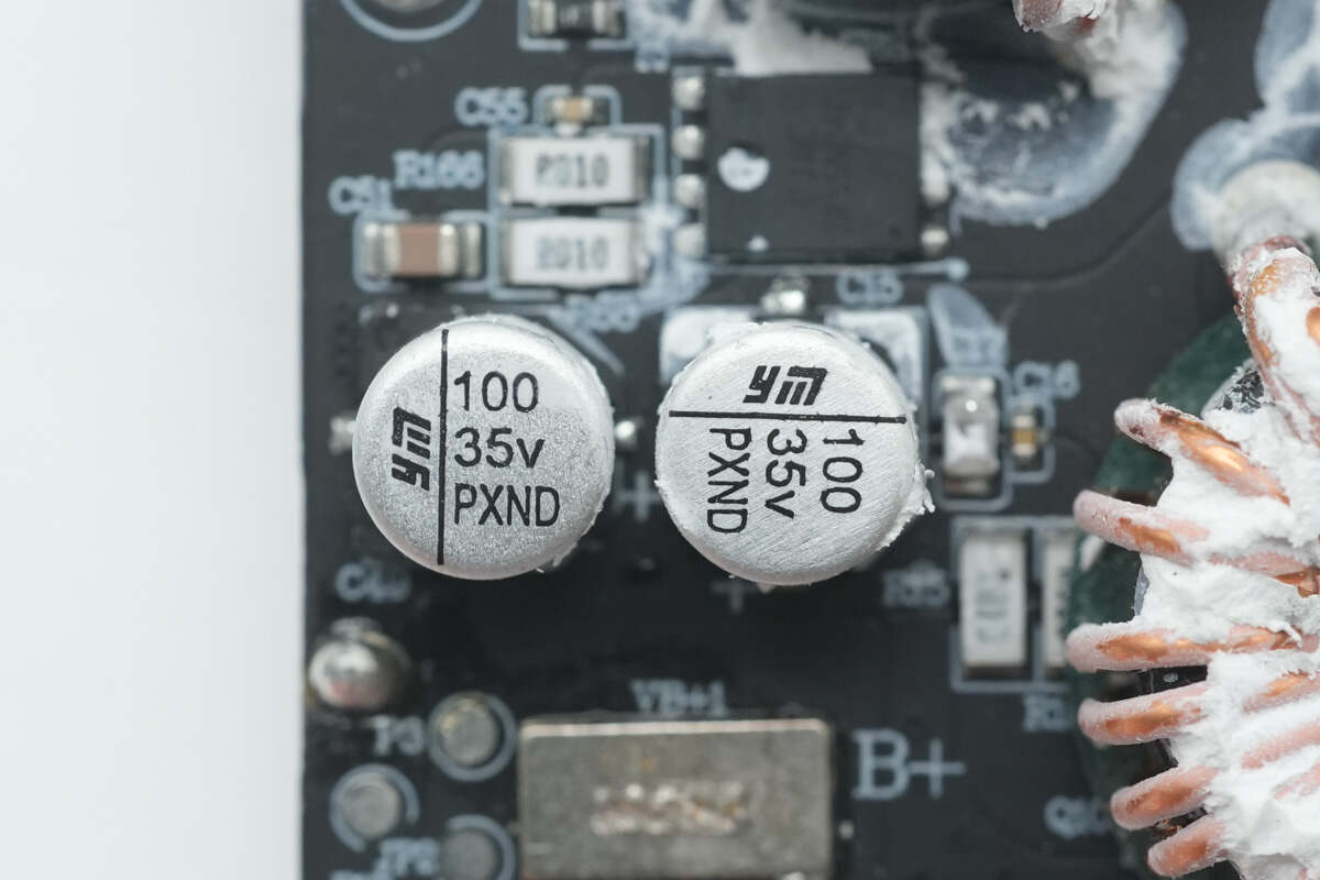 电池端滤波固态电容来自永铭,规格均为35V100μF。