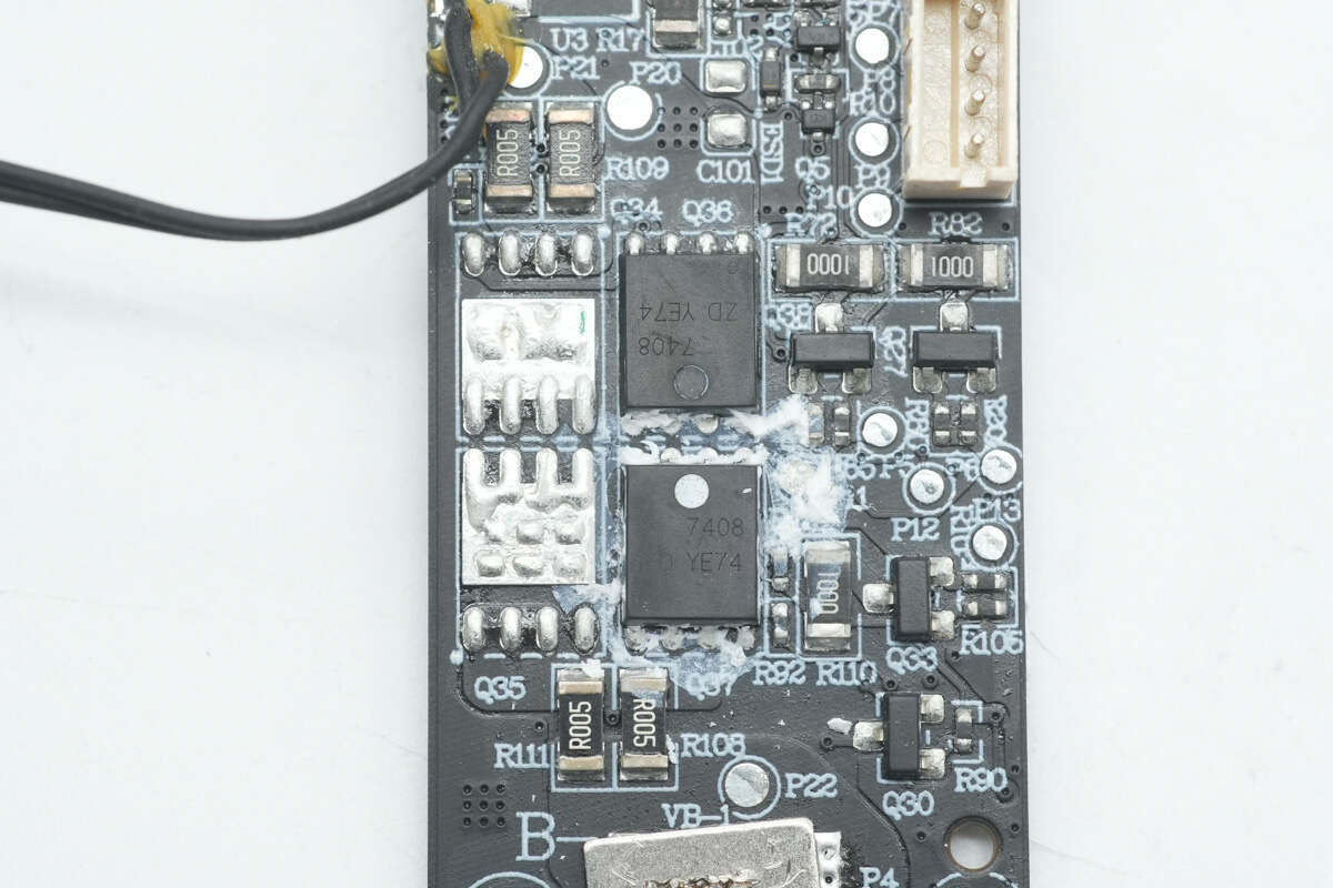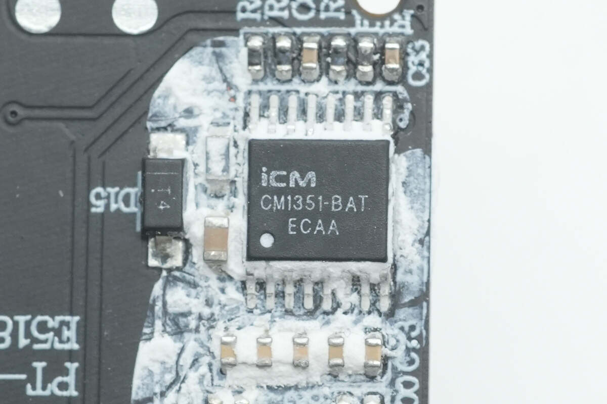 将PCB板上白胶清理掉,板子正面设有锂电保护管、MCU、同步降压转换器、同步升降压开关管、滤波固态电容以及VBUS开关管。