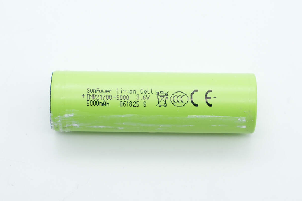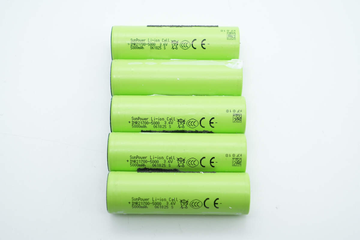 五颗电芯来自SunPower长虹三杰,型号为INR21700-5000,标称电压3.6V,标称容量5000mAh,充电限制电压4.2V,已通过CCC和CE认证。