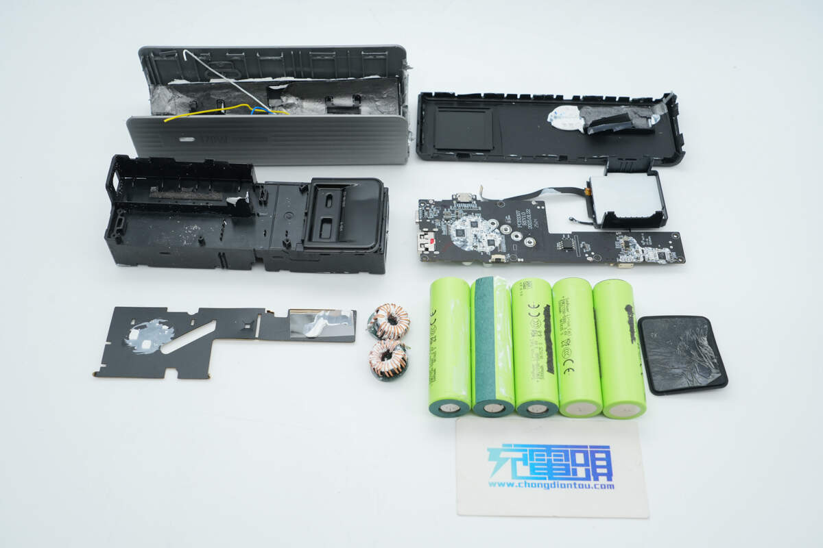 充电头网通过拆解了解到,移动电源同样是采用了五颗长虹三杰INR21700-5000锂电池组成电池组,并配备创芯微CM1351-BAT锂电保护方案以及热敏电阻进行温度监控,国家CCC认证加持,25000mAh容量提供强力续航同时保证安全可靠性。